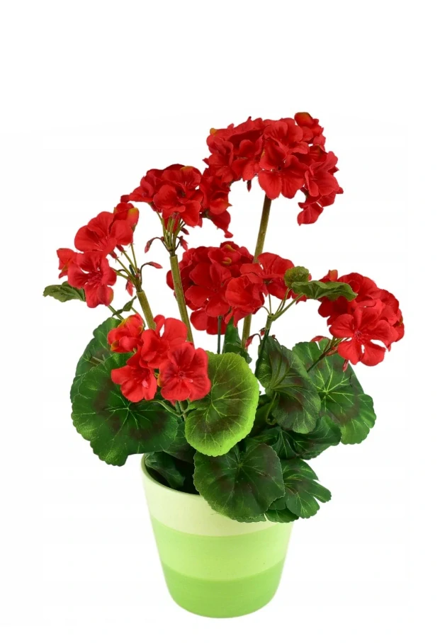 Umělá květina Muškát s červenými květy v zeleném keramickém květináči je skvělým doplňkem pro vaše interiéry. Tento stylový výrobek se skládá ze 7 květů muškátu v intenzivní červené barvě, které dodají Vašemu domovu eleganci a šarm.