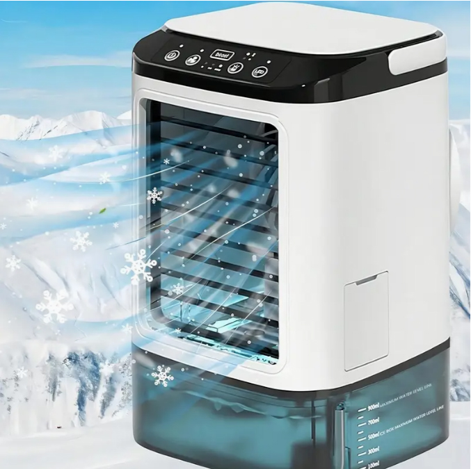 Ventilátor s mini klimatizací 4 v 1: Tato mini klimatizace kombinuje běžný ventilátor (bez vody a ledu), zvlhčovač vzduchu (s přidáním vody), přenosnou klimatizaci (s přidáním ledu a vody) a noční světlo, tedy jedno zařízení se 4 hlavními funkcemi. Dokáže ochladit horký a suchý vzduch pro malé prostory pomocí vody a kostek ledu. Není nutná instalace, uvnitř není žádná baterie.