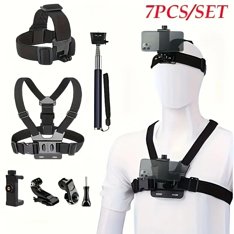 7ks - nastavitelné popruhy na hrudník, na hlavu, selfie tyč atd.
