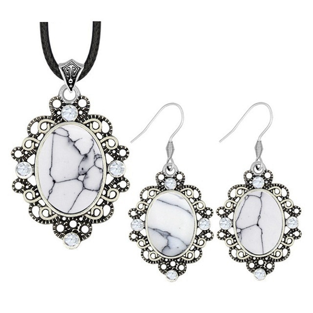 Krásná Vykládaná SADA Náhrdelník Náušnice Starožitný styl   Kámen Tyrkysový Mramor (Kámen je syntetický). celý popis